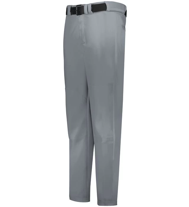 Guard homebase in the Solid Change Up Baseball Pant from Russell Athletic®. These baseball pants are constructed from 11 ounce, 100% polyester stretch double knit fabric with stain release and feature a hook-and-loop adjustment system designed to be less harsh against skin. Reinforced knees and an open bottom provides comfort while out on the field.